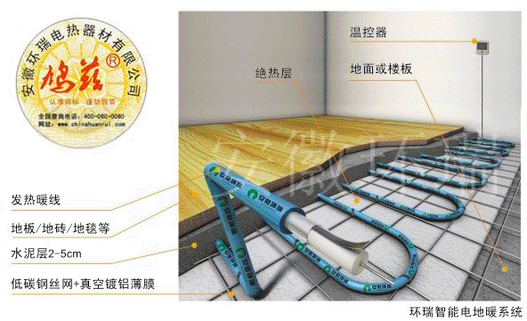 電地暖利用發熱電纜轉化為熱能,通過地表傳熱由下之上的地面輻射供暖系統 安徽環瑞電地暖廠家銷售電話:0551-67776888,傾力十年打造中國安全型電地暖品牌