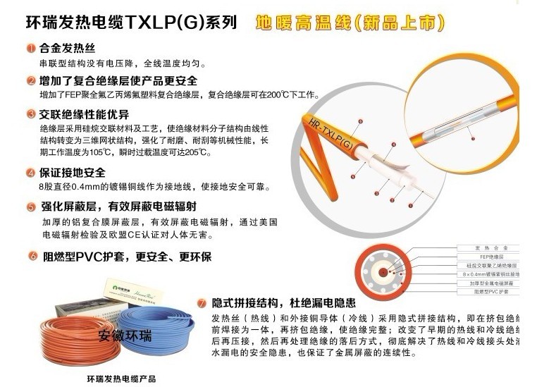 安徽環瑞提供的一種畜牧養殖幼崽專用發熱電纜,包括有發熱合金,所述的發熱合金外依次包覆有塑料導體、氟隆絕緣層、火焰及蒸汽交聯聚乙烯絕緣層、鍍錫紫銅絲接地、加厚型金屬電磁屏蔽層、阻燃型PVC外護套和彈性橡膠軟套,所述的發熱合金和塑料導體融為一體,防止電打火的情況發生。