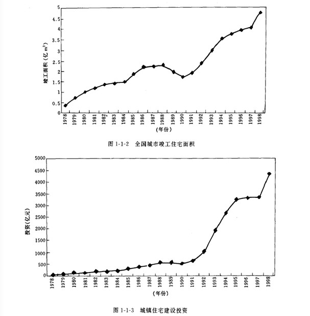 我國地域廣闊.人口眾多.房屋建筑規模巨大。其中住宅建設約占居住建筑的92%.而住宅,是世界各國都面臨的社會問題。“人人享有適當的住房”已成為聯合國第二次人居大會所提出的戰略目標。改革開放以來.從1979年到1998年底.我國城鄉新建住宅建筑面積158億 ㎡其中城鎮住宅宅 約35億 ㎡.農村作宅約123億MI.全國城市人均居住面積從3. 6 ㎡增加到9.3 ㎡(圖一1一1).竣 工面積從3 752萬 ㎡增加到47 600萬 ㎡(圖1-1-2).城鎮住宅建設投資從39.21億元增加到4 310.81億元(圖1-1 3). 1.7億戶遷入新居."八五"期間共完成城市住宅建設投資8 543億元.竣工 住宅10.5億 ㎡,僅1995年住宅竣工面積3.3億 ㎡.比“七五”期間增長76%.九五.期間計劃建設 住宅12億 ㎡,比“八五”期間增長14.3%.到1999年底。我國設城市加為668個.當年全國城市新 建房屋竣工面積4.362 5億㎡.其中住宅2.971 6億㎡.當年底.全國住宅總使用面積為30.505 2億 ㎡.總居住面積為21.011 2億㎡.人均使用面積達到14.2 ㎡.人均居住面積達到9. 8 ㎡分別比上 年增長0.6和0. 5 ㎡.居民生活條件大有改善。住宅建設量大面廣.至今仍呈上升趨勢.而且這個 上升趨勢還將持續20-30年。由此看出,我國住宅建設正處于快速發展階段.不僅是中國歷史上的 最高峰.也是世界上任何一個國家所不可比擬的。