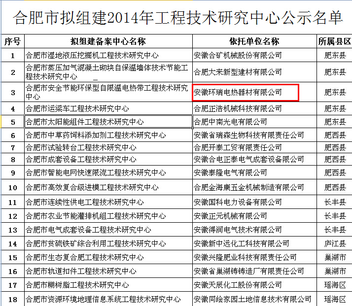 根據《合肥市工程技術研究中心管理辦法》要求,擬組建2014年合肥市工程技術研究中心,安徽環(huán)瑞電熱器材有限公司成功進入合肥市工程研究中心名單: