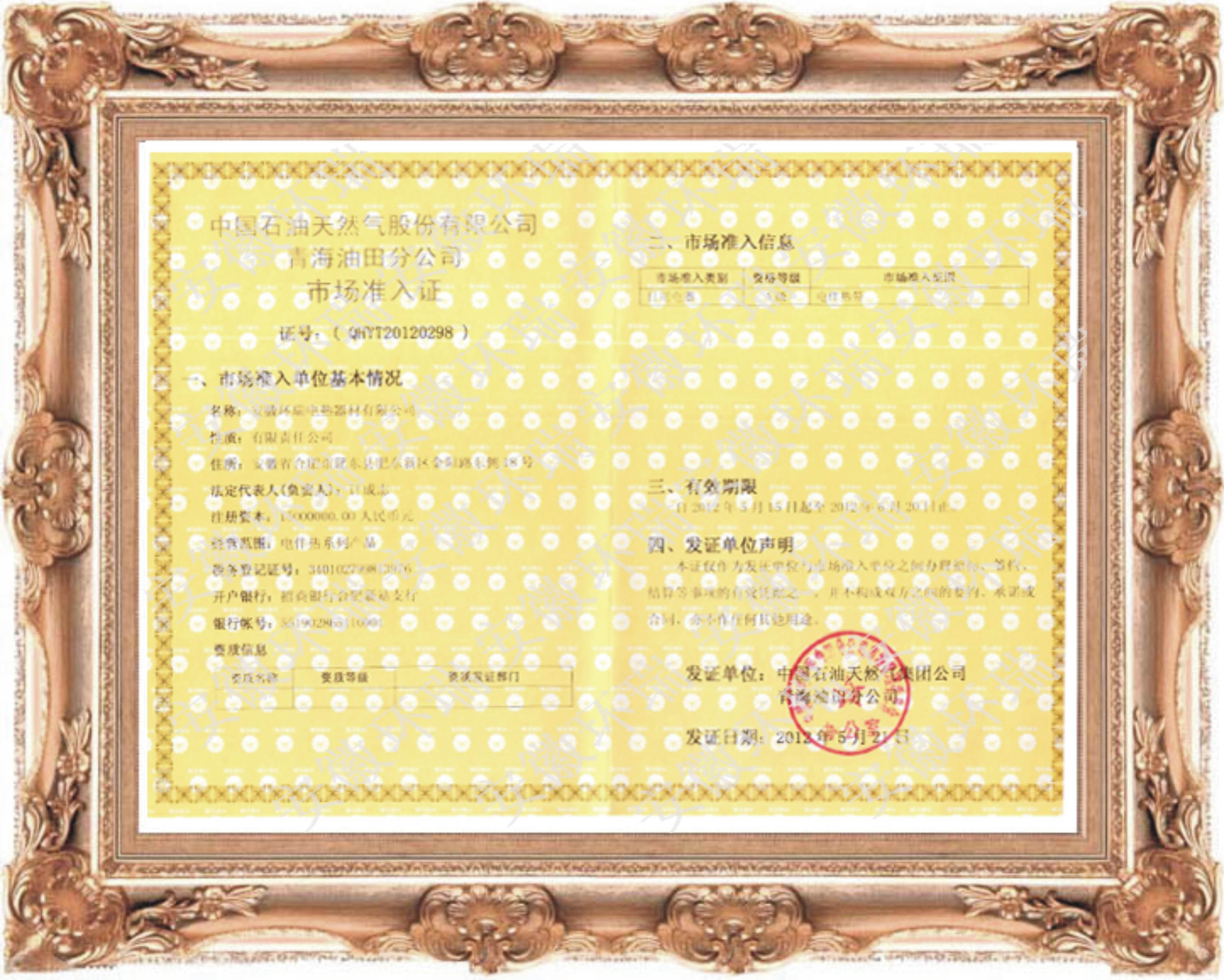 安徽環瑞獲得青海油田電熱帶物質準入證,這是針對地方油田的第二道門檻。迄今為止,我司通過長期貿易往來,中標的方式獲得了大慶油田,克拉馬依油田,華北油田,遼河油田等中石油旗下子公司的電熱帶準入證。并與2011年4月初,獲得中國石油天然氣集團公司物資供應商一級準入證。《物資供應商準入證》是與中石油總部管理的旗下全資子公司、直屬企業和事業單位具有同等的供貨準入證,供應商可在準入產品范圍內向中石油天然氣集團公司供貨。