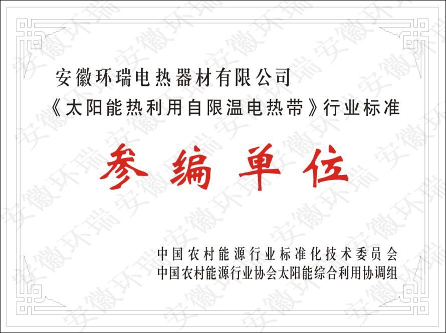 安徽環(huán)瑞電熱器材有限公司長期致力于自限溫電伴熱帶在各行業(yè)的應(yīng)用,尤其是太陽能專用自限溫電伴熱帶,并研發(fā)出一種安全節(jié)能的太陽能電伴熱帶-納米阻燃本質(zhì)安全型電熱帶,獲得了國家專利證書和省高新技術(shù)產(chǎn)品,針對目前國內(nèi)層次不齊的電熱帶質(zhì)量,為了規(guī)范太陽能電熱帶的市場,提高產(chǎn)品的質(zhì)量。安徽環(huán)瑞與多家電伴熱同行企業(yè)共同起草《太陽能熱利用自限溫電熱帶》,此標(biāo)準(zhǔn)由中國農(nóng)村能源行業(yè)協(xié)會提出。能源行業(yè)農(nóng)村能源標(biāo)準(zhǔn)化技術(shù)委員會歸口,是專門針對太陽能行業(yè)的自限溫電熱帶標(biāo)準(zhǔn),具有重要意義。