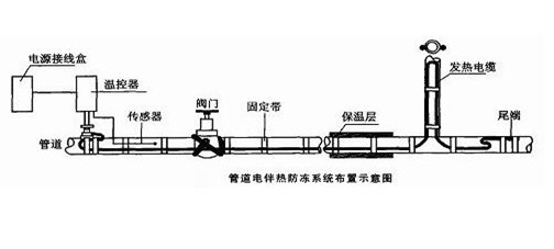 當敷設單根電熱帶時,敷設時應盡可能使電熱帶平整地緊貼在管道表面,用聚酯帶或鋁箔膠帶固定,嚴禁用細絲捆扎,如遇法蘭、閥門等尖銳突起部分,應注意保護。在水平管道上安裝時,可敷設在管道下45度側方,用玻璃纖維壓敏膠帶或鋁膠帶每隔約30Cm處將電熱帶固定于管道上。如上圖電熱帶應按管道長度分布,以免物料在無電熱帶處降溫凝結,電熱帶的長度應長于被伴熱管道。在線路的第一供電點和尾端各預留1m長的電熱帶。電熱帶在穿過墊木等支架時,應在支架上打眼穿孔,必須保證伴熱帶緊貼在管道上,再使用密封膠封堵。每個回路的電熱帶安裝完畢,再確認整個回路長度滿足設計要求后,才可剪短電熱帶。